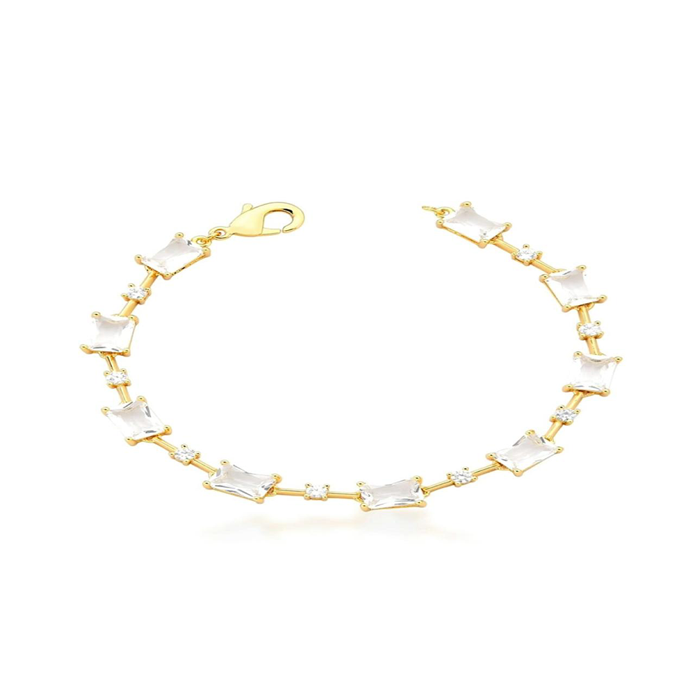 PULSEIRA BANHADA A OURO,COM PEDRAS RETANGULARES(9) 5X7 MM 17 5CM BASE EM LIGA METALICA DE COBRE E ZINCO, VERNIZ DE PROTEÇÃO,QUE GARANTE DURABILIDADE A PEÇA NÃO POSSUI NIIQUEL EM SUA COMPOSIÇÃO. UTILIZAMOS,CAMADA ANTI ALERGICA.