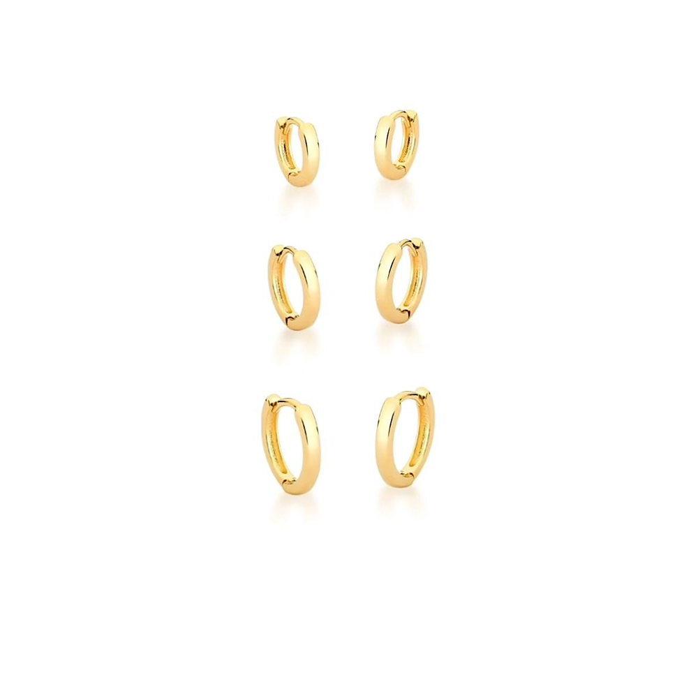 3PARES DE ARGOLAS LISAS EM TAMANHO DECRESCENTE. BANHADO A OURO 18K BASE EM LIGA METALICA DE COBRE E ZINCO, VERNIZ DE PROTEÇÃO,QUE GARANTE DURABILIDADE A PEÇA NÃO POSSUI NIIQUEL EM SUA COMPOSIÇÃO. UTILIZAMOS,CAMADA ANTI ALERGICA.